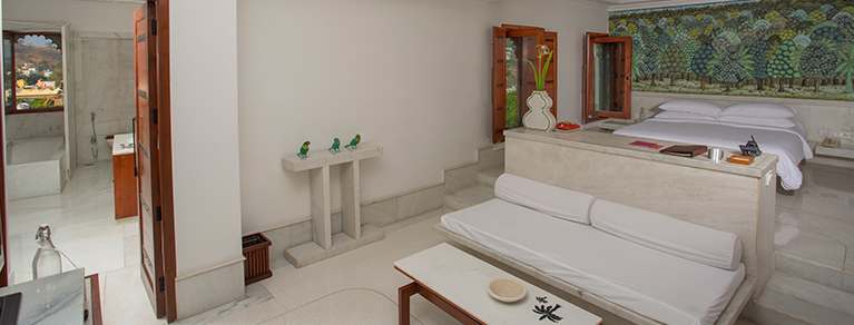 Holding a commanding position with views out across the valley and the village of Delwara, Devigarh showcases an array of decorative styles and tranquil landscaped gardens. Minimalist interiors are polished and comfortable and beautifully juxtapose the ancient, ornate backdrop.