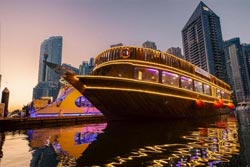 Later in the evening you will be picked up for Marina Dhow cruise with live performances and BBQ dinner. Take in the nighttime lights and sights of the Dubai Marina on this evening dinner cruise. You'll hop aboard a traditional Dhow (a one- or two-masted Arab sailing vessel) that includes a glass-enclosed lower deck and an open-air upper deck. As you cruise along the artificial canal, catch views of Dubai's famous attractions and skyscrapers and enjoy a buffet dinner.