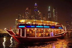 Arrival at Dubai Intl. airport and after immigration formalities you meet our representative who will help you board a vehicle and transfer to your pre-booked hotel. Check-in at the hotel and the remainder of the day is at leisure. In the evening you will be picked up for Marina Dhow cruise with BBQ dinner and live dance performances. Take in the nighttime lights and sights of the Dubai Marina on this evening dinner cruise. You'll hop aboard a traditional Dhow (a one- or two-masted Arab sailing vessel) that includes a glass-enclosed lower deck and an open-air upper deck. As you cruise along the artificial canal, catch views of Dubai's famous attractions and skyscrapers and enjoy a buffet dinner.