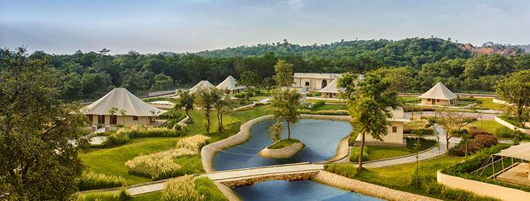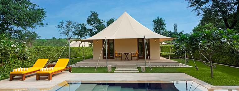 The Oberoi Vanyavilas in Ranthambore is the perfect base from which to explore the territory of the majestic tiger. Vibrant frescoes and richly detailed interiors create the ambience of a royal hunting palace. The setting is pictureperfect with a dramatic watercourse and sun-kissed private decks. The luxury tents with finely embroidered canopies, luxurious bathrooms and private walled gardens are in perfect contrast to the ruggedness of the jungle.